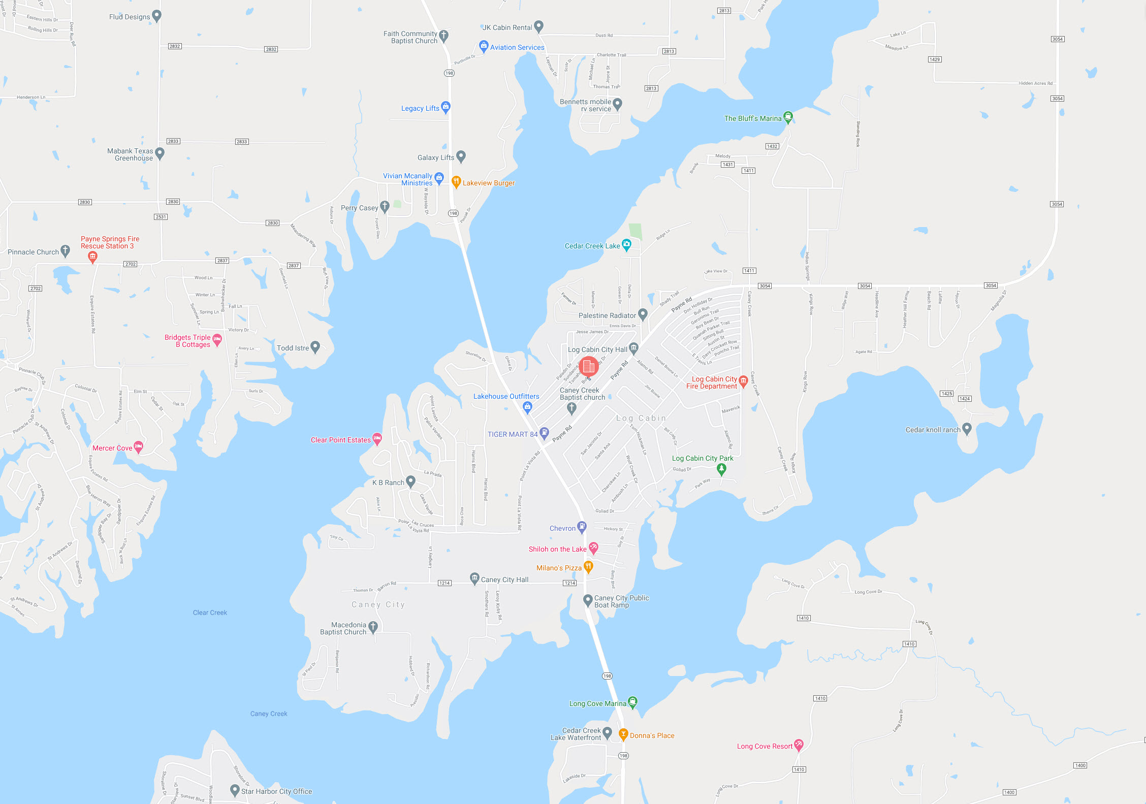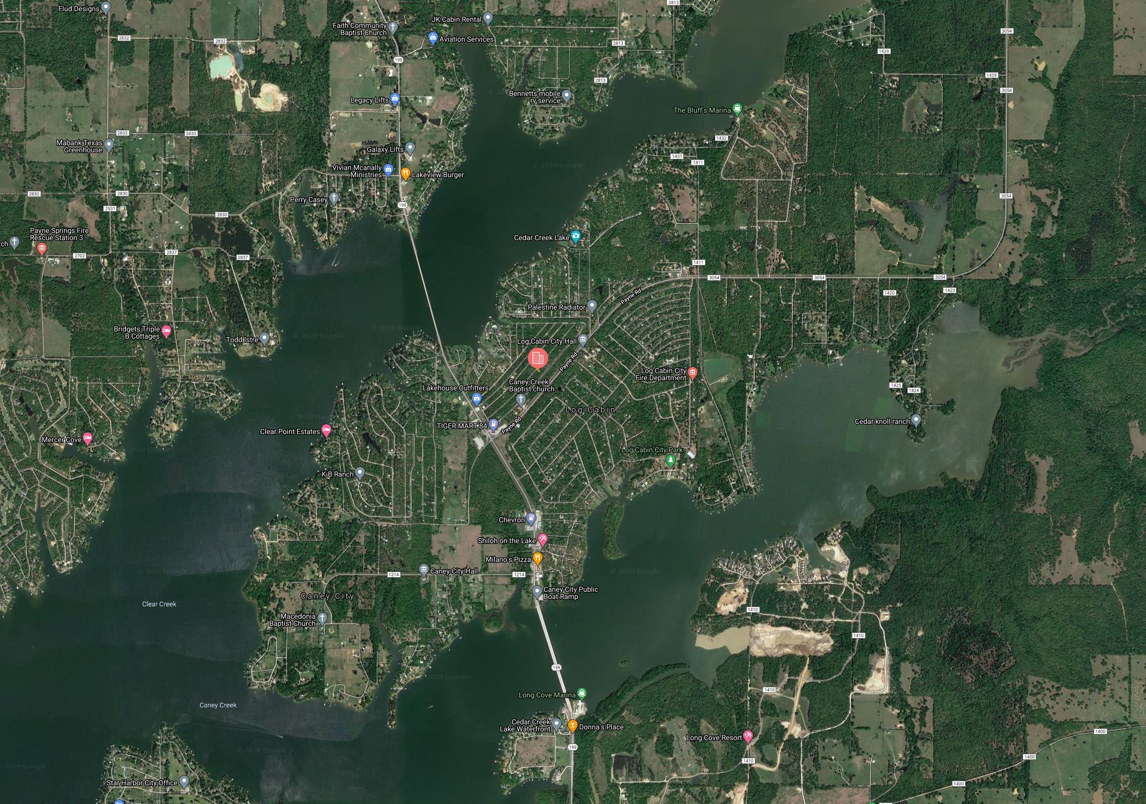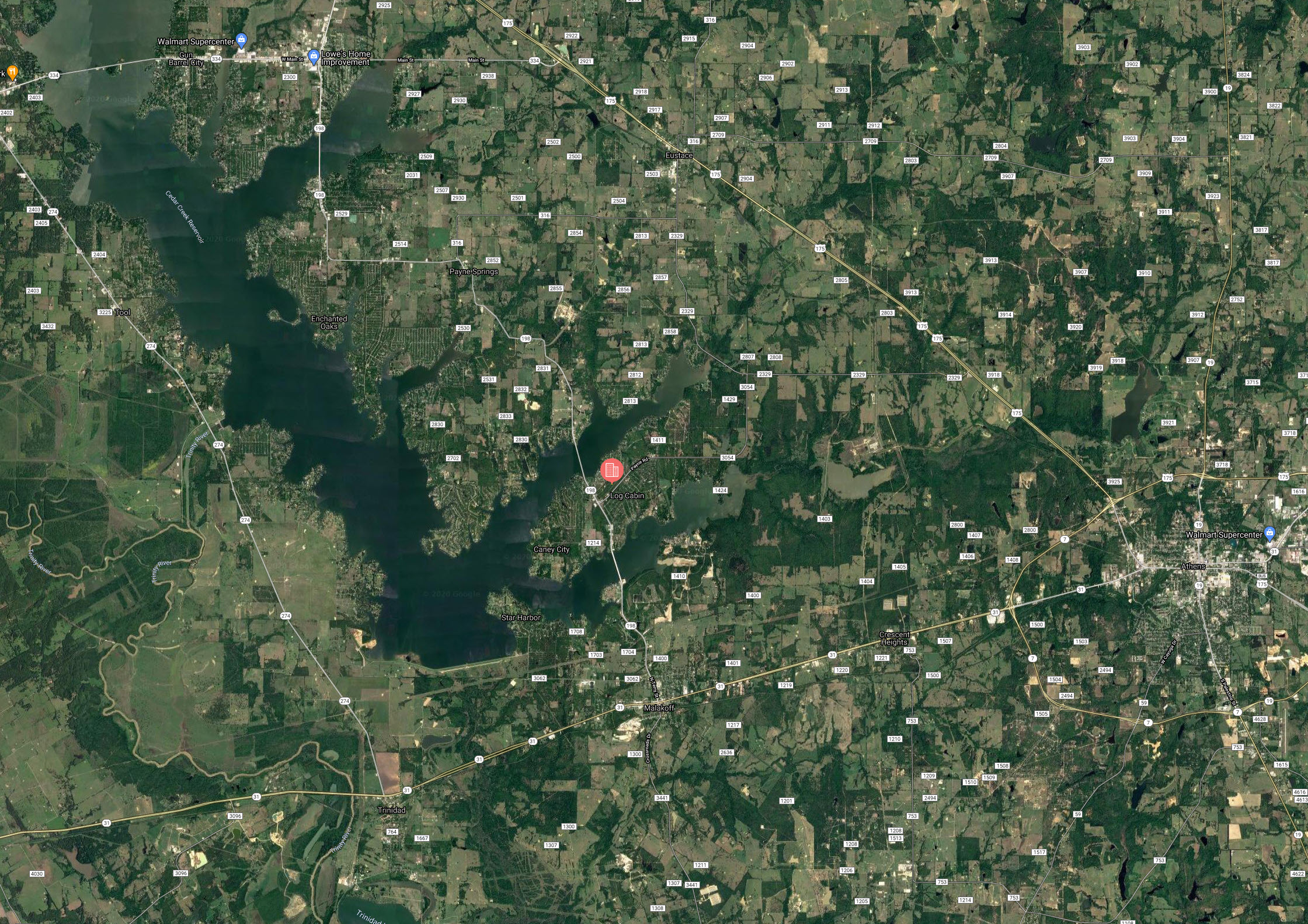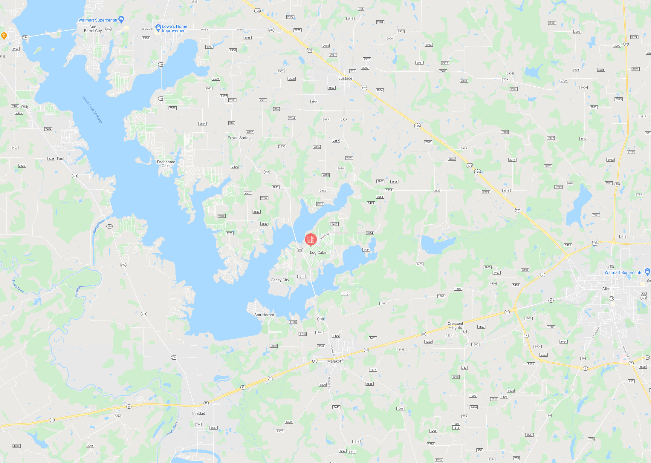 Log Cabin is located just southwest of Dallas, Texas, less than a hour drive and right next to Cedar Creek Lake. Cedar Creek Lake is the 4th largest lake in Texas, being 32,623 acres, 18 miles long and offers 320 miles of shoreline. Blue catfish, Channel catfish, Flathead catfish, Largemouth bass, White bass, Hybrid striped bass, and Crappie are the predominant fish species of Cedar Creek Lake.