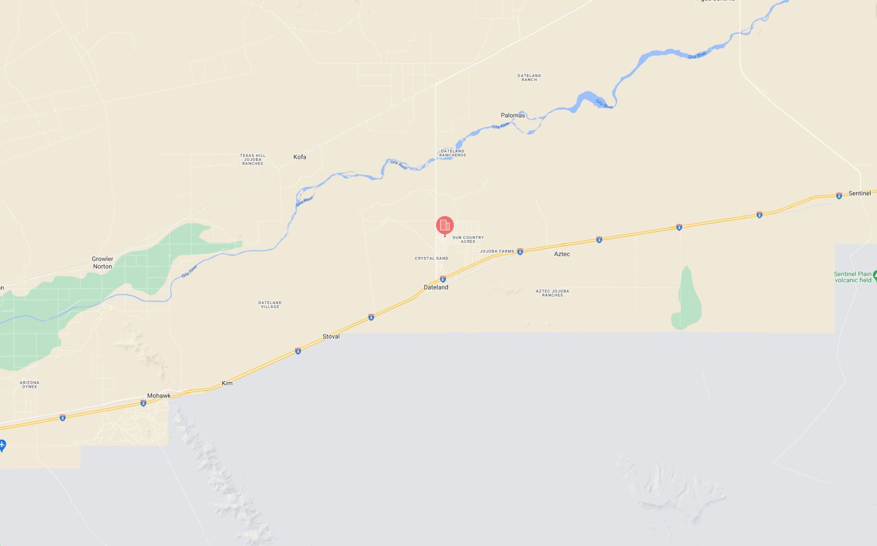 Dateland is a small town located about 120 miles west of Phoenix and on the southwest corner of Arizona along the Colorado River and California border.